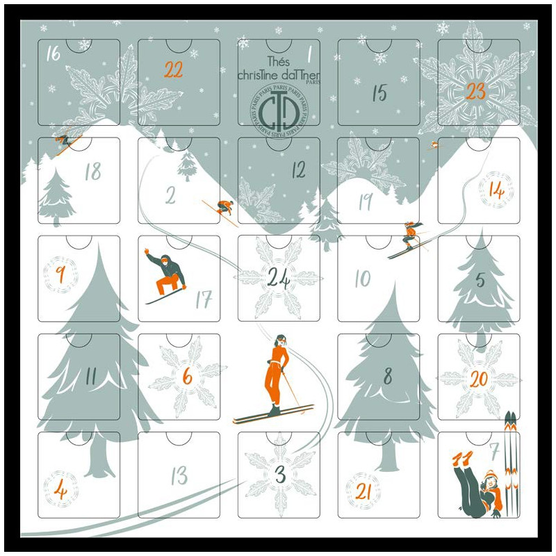 Cette année ChrisTine DaTTner nous enivre avec son superbe calendrier de l'Avent qui comprend 23 sachets de thé suremballés de 2g et un sachet pour Noël de 10g.
