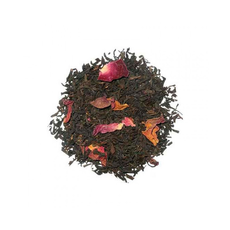 Mélange de thés noirs de Chine et de Ceylan aromatisé à la Rose avec pétales de fleurs.