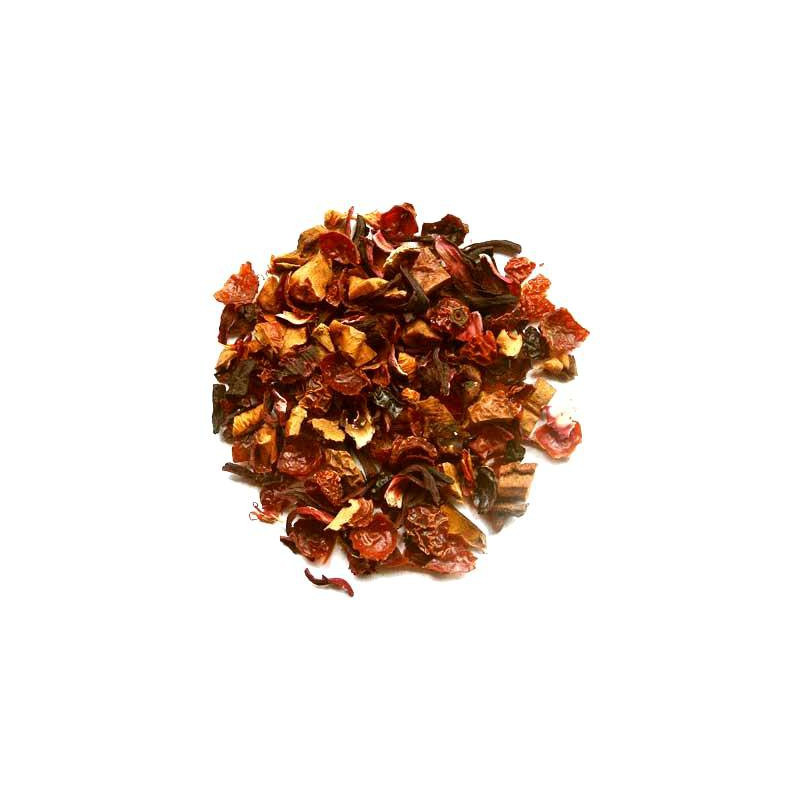 Mélange de fleurs d'hibiscus, morceaux de pommes, écorces d'églantier, écorces d'orange (4,5%), arôme naturel, fleurs d'oranger (1,8%), fleurs de tournesol arôme naturel d'orange sanguine.