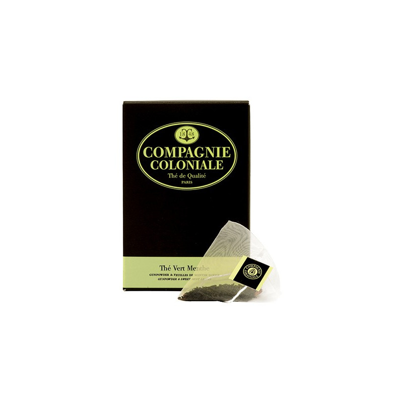 Thé vert de Chine aromatisé à la menthe, le thé idéal pour se désaltérer, conditionné en boite de 25 sachets pyramidale berlingo® créé par Compagnie Coloniale.